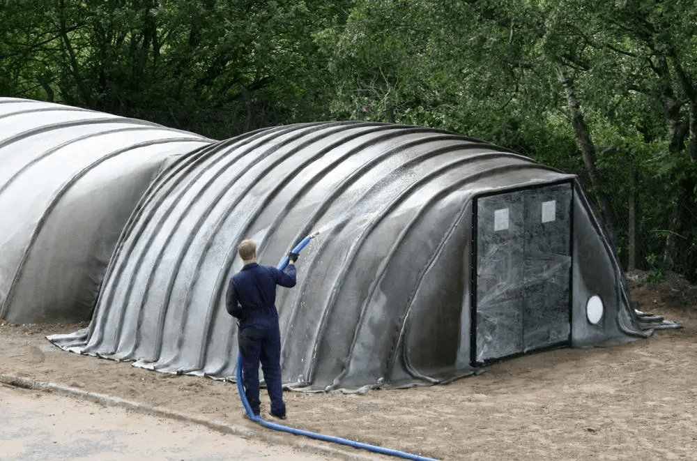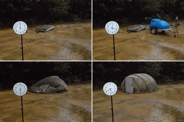 首先在一處空地鋪上“充氣帳篷”,花幾分鐘時間充滿氣成型后再打上地釘固定好,最后一步向帳篷淋上足夠多的水,等待24小時,一座能夠使用25年之久的帳篷就完成了。