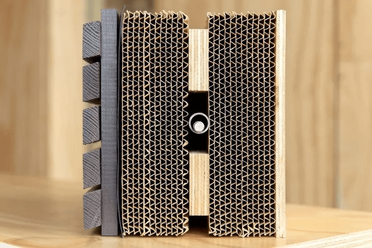 紙板層間是用環(huán)保的強力膠黏合,以確保耐久性和絕緣性。最后用防水箔和木板做保護層。